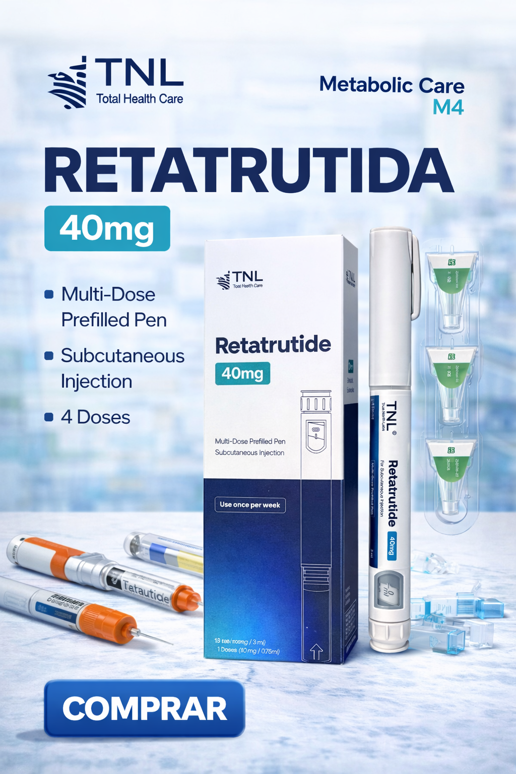 A Retatrutida TNL Metabolic Care M4 é apresentada em formato de caneta multidose pronta para uso, desenvolvida para aplicações subcutâneas com praticidade, precisão e segurança.